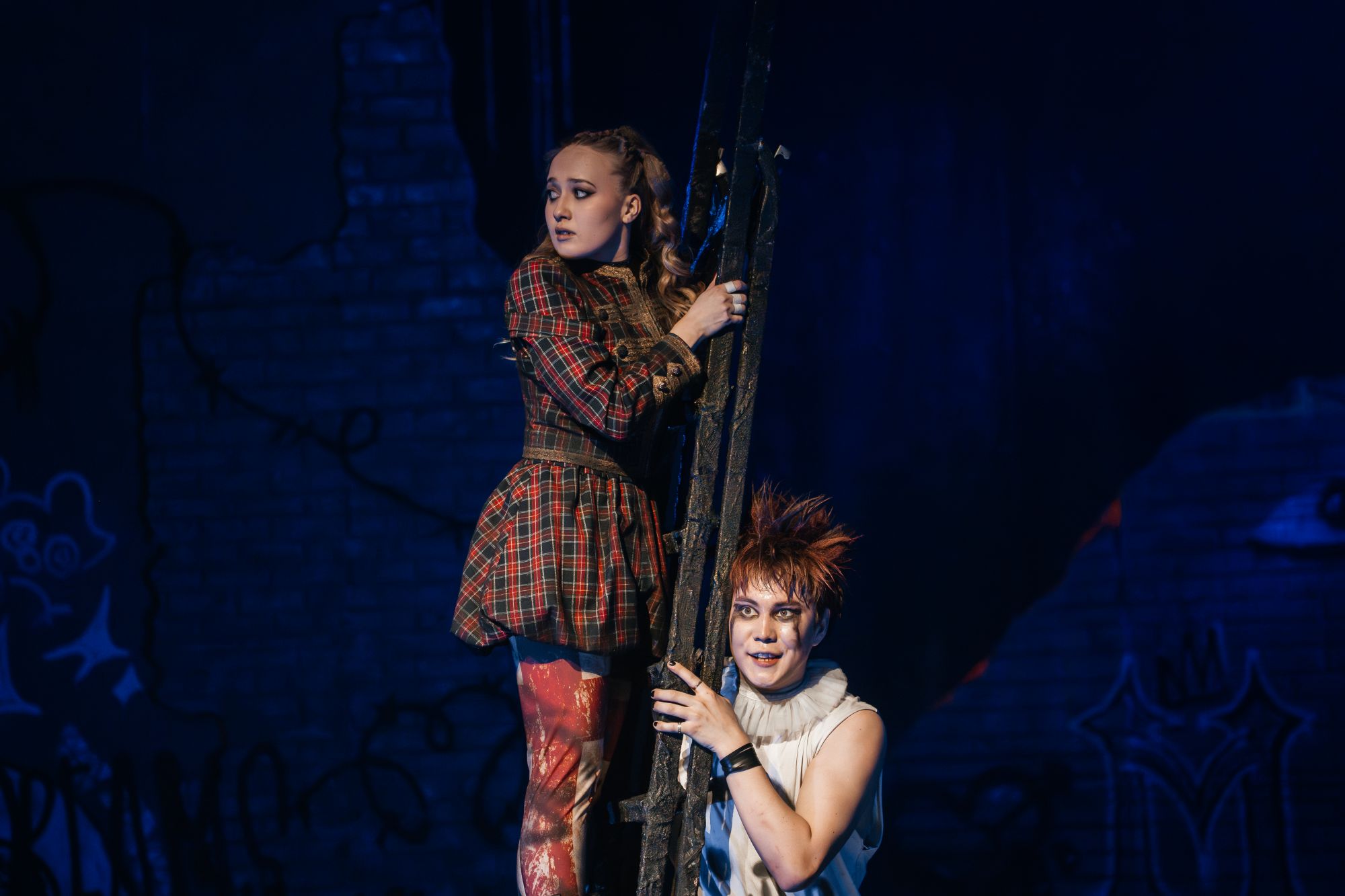 - Когда мы ехали на гастроли, Евгений Максимович в поезде мне рассказал, что в спектакле будут панки, руины, цепи, и я опять же испугалась, потому что совершенно ничего не понимаю в панках, но потихонечку начала смотреть фильмы, видео, какие-то отрывки, в принципе читать про эту субкультуру, узнавать, кто такие панки. И конечно же, все сводилось к тому, что это протест против системы, который присутствует в спектакле, в пьесе это протест двух влюбленных, так скажем.