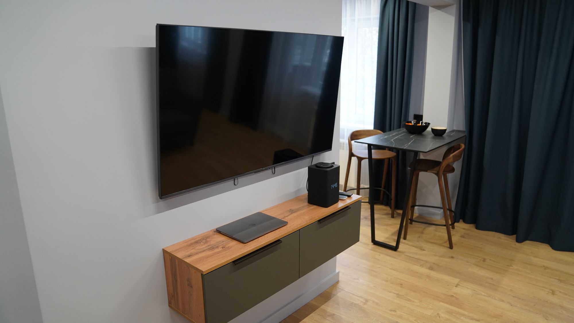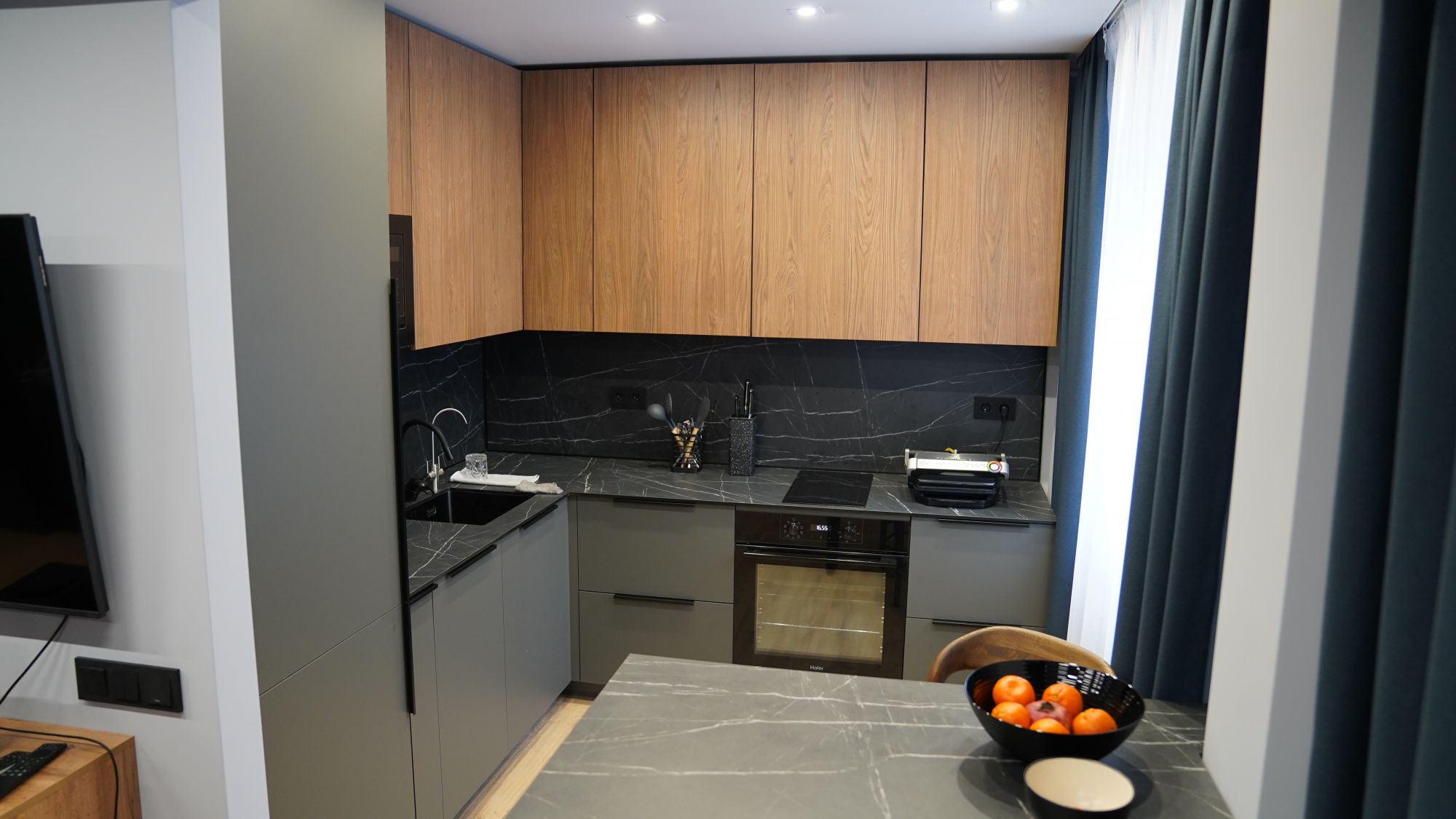Особое внимание уделили функциональности. На кухне спроектировали всю встроенную технику — микроволновку, духовку, посудомоечную машину и холодильник — так, чтобы они были невидимы, но максимально удобны. Парящая тумба под телевизором стала не только стильным акцентом, но и решением для хранения медиатехники и аксессуаров.