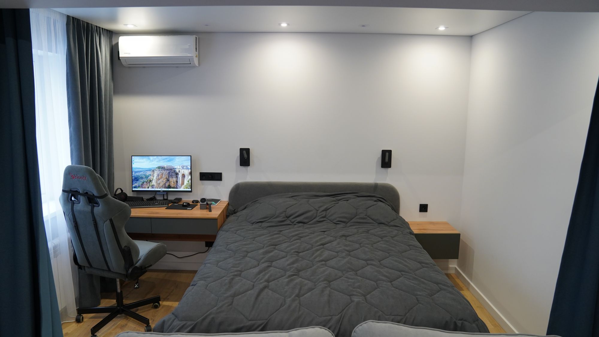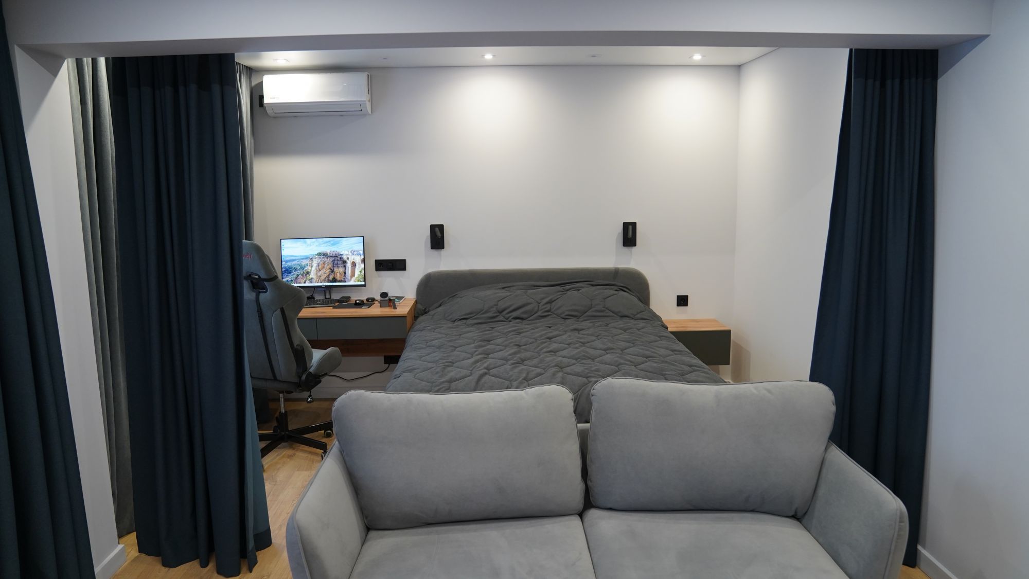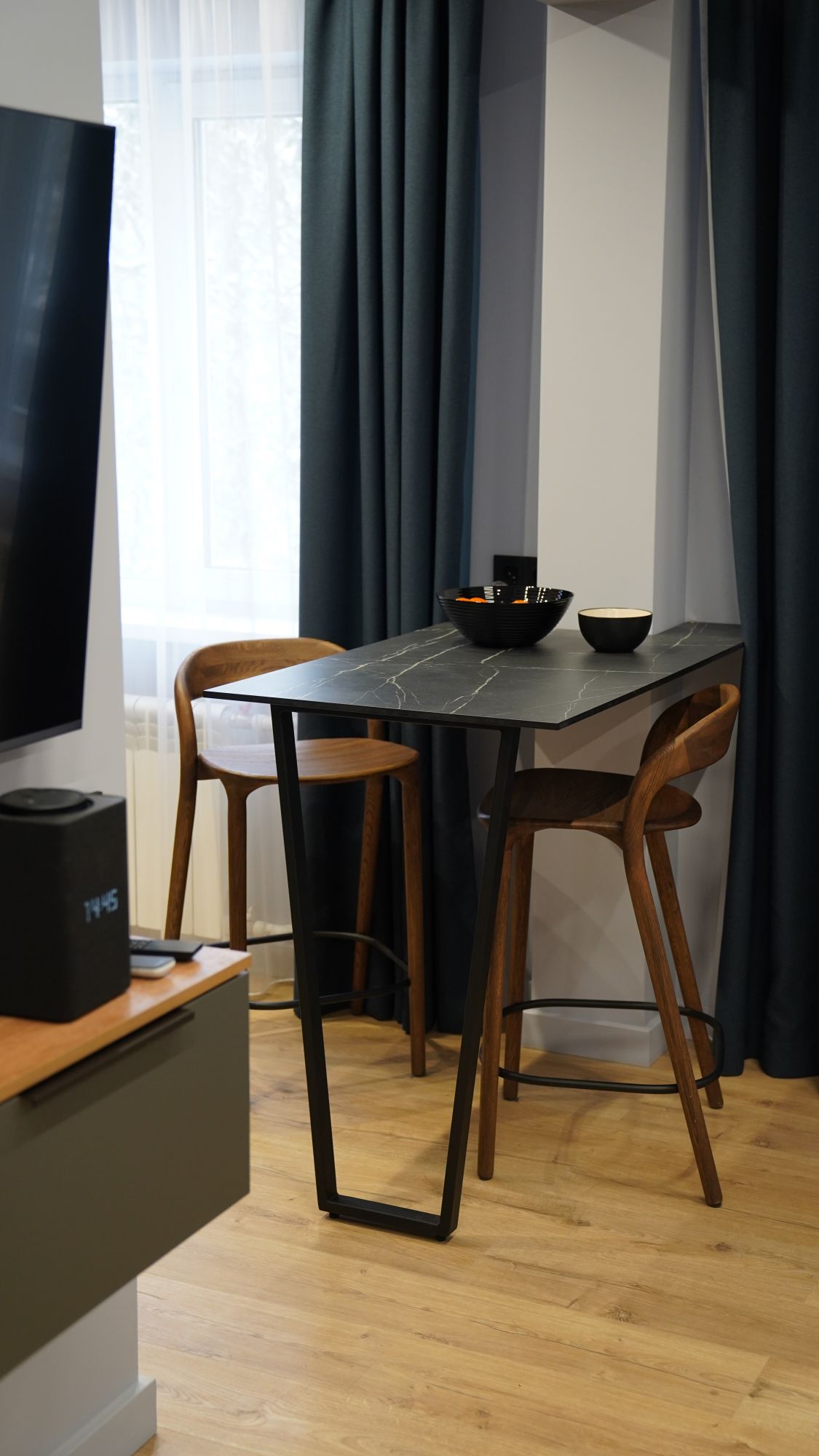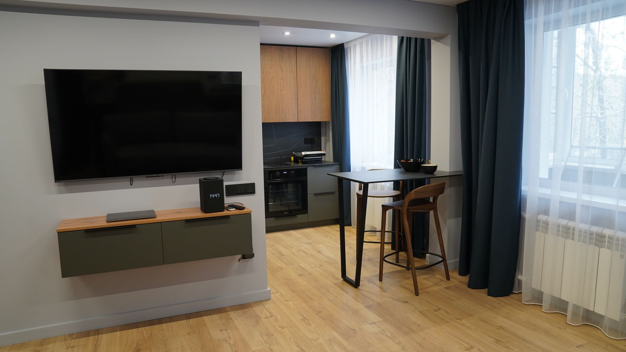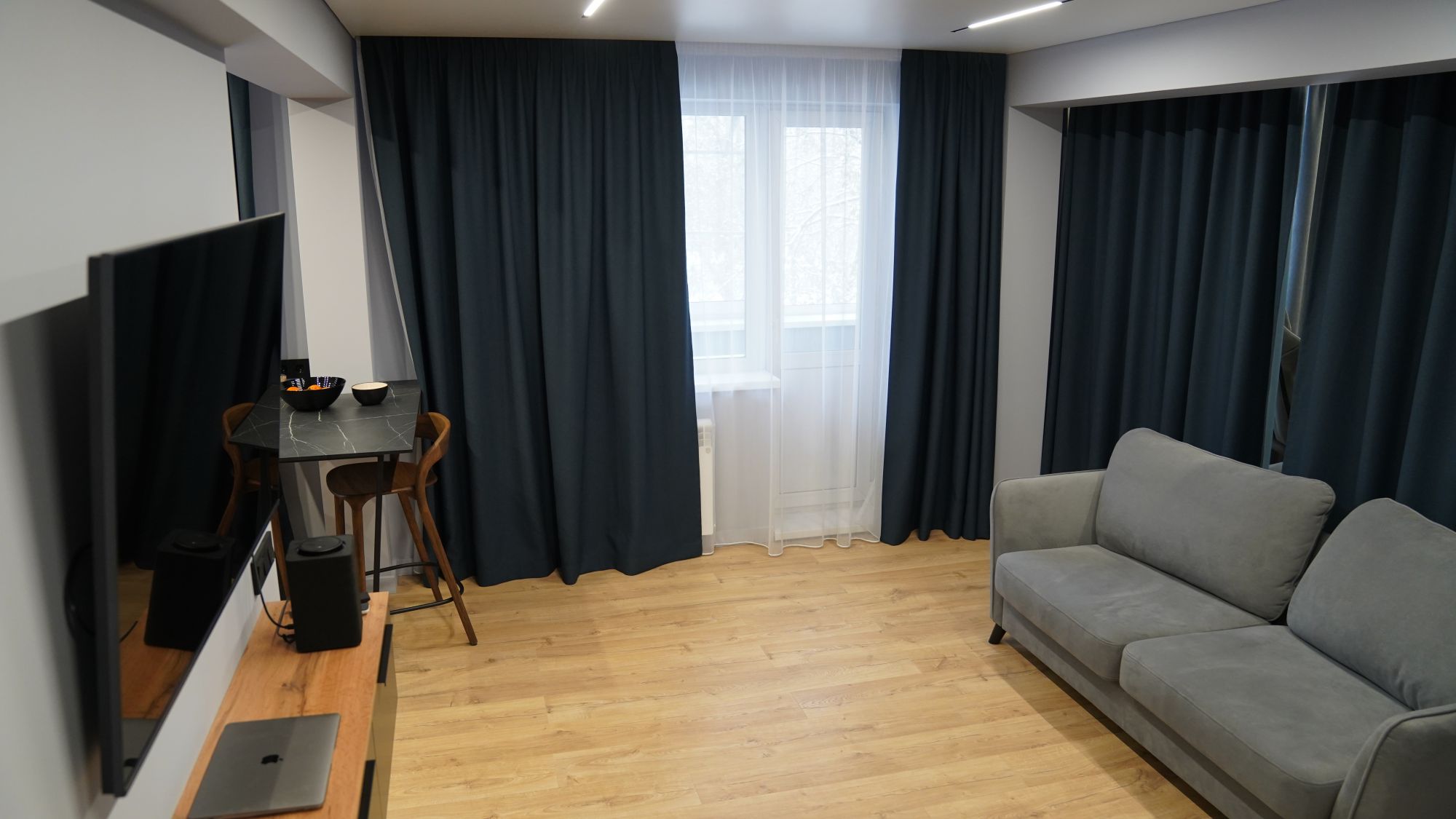 Функциональное пространство теперь работает на владельца: удобная кухня-гостиная для встреч с друзьями, уединённая спальня с вместительной гардеробной, эргономичная ванная комната без «мёртвых зон». Также продумано зонирование, с помощью качественных текстильных штор. Всё это стало возможным благодаря не только дизайн-проекту, но и профессиональной работе отделочной бригады, которая чётко следовала чертежам и стандартам.