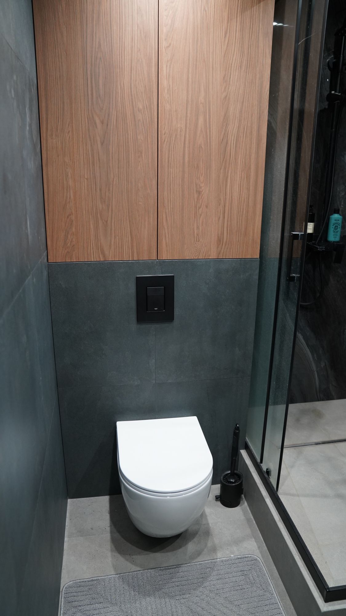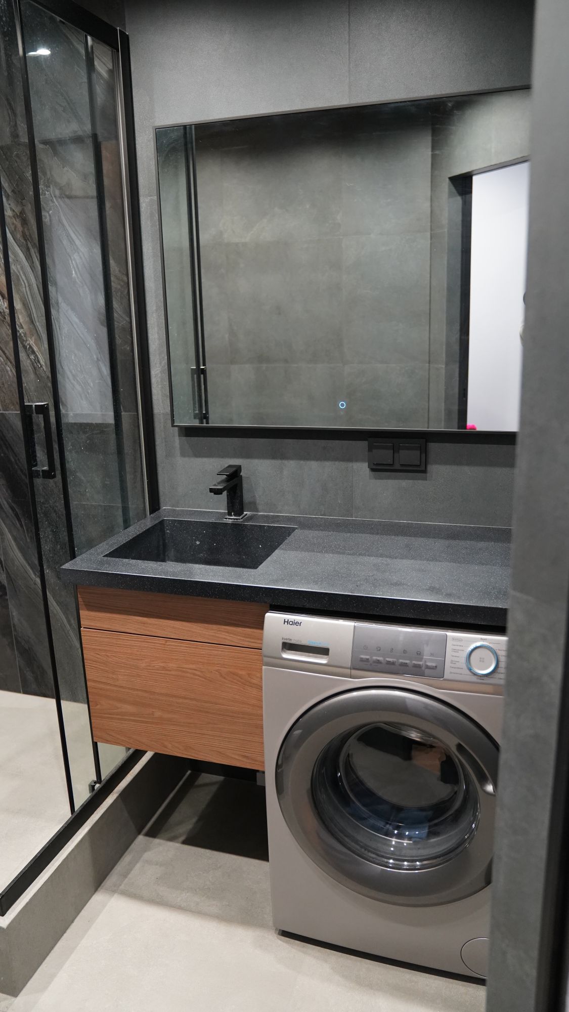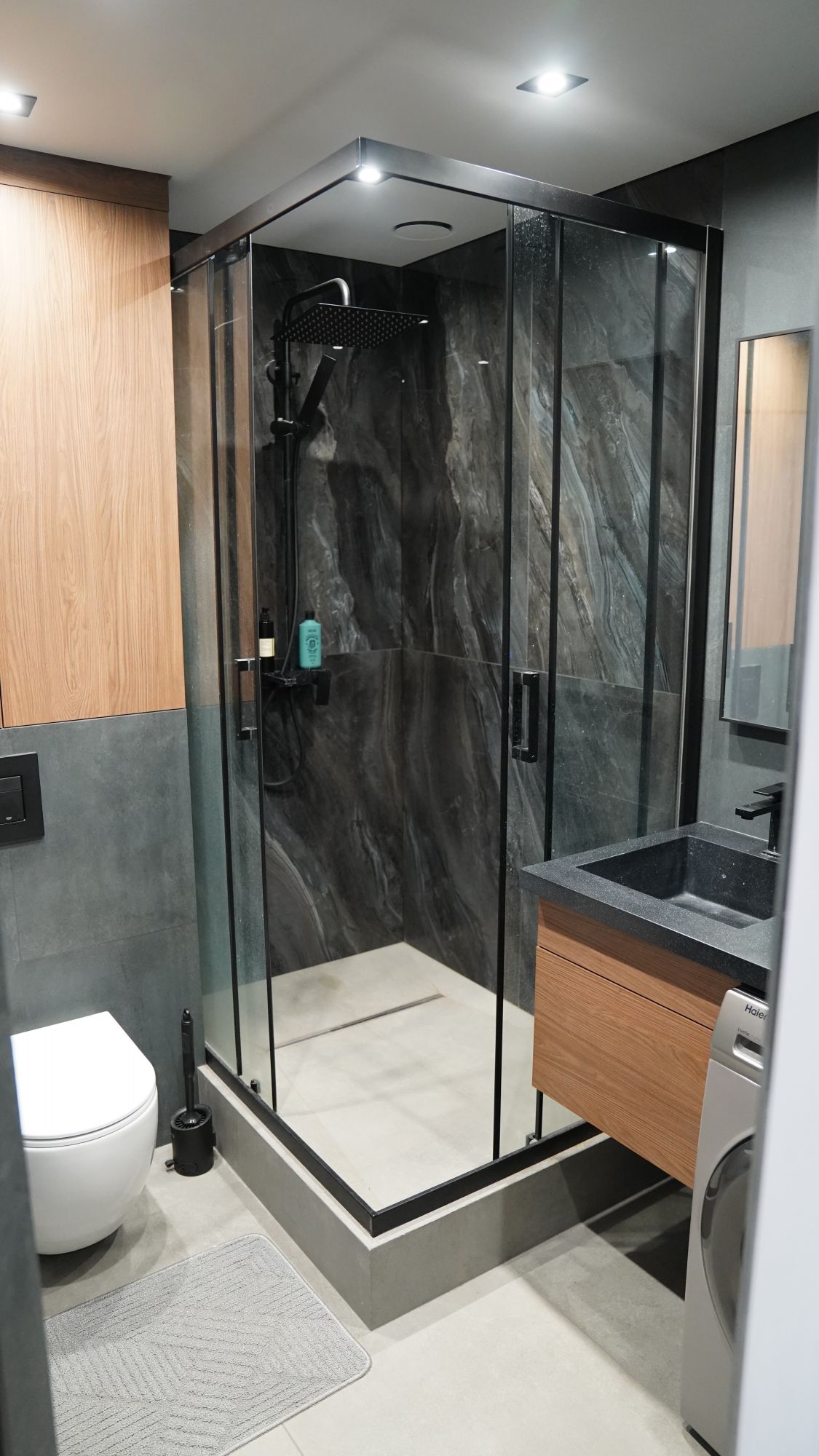 Санузел: санузел полностью переосмыслен. Вместо тесной ванной — просторная душевая с современным слив-трапом, выполненная в тёмных тонах. Стиральная машина размещена под столешницей раковины — эргономичное решение, освобождающее пространство и сохраняющее цельность отделки.