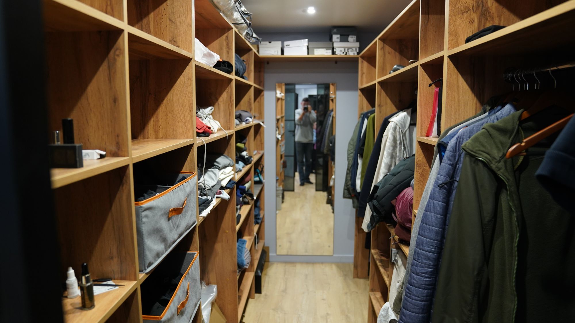 Гардеробная: гардеробная комната — отдельное достижение проекта. Мы выделили под неё часть спальной зоны, организовав большое, функциональное пространство для хранения. Стеклянная перегородка (матовое или прозрачное остекление - в зависимости от задачи) выполняет роль деликатного зонирования: она отделяет гардеробную от спальни, но при этом сохраняет ощущение простора и пропускает естественный свет. Внутри — эргономичная система хранения: открытые и закрытые секции, выдвижные ящики, штанги для плечевой одежды.