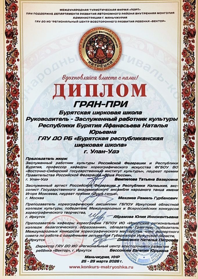 Воспитанники Бурятской республиканской цирковой школы успешно выступили на международном фестивале-конкурсе «Матрёшка», который прошёл в китайской Маньчжурии.