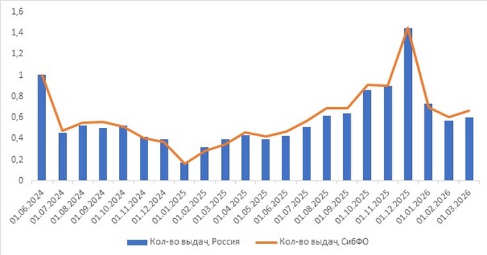 Выдачи ипотеки в Сибирском ФО, как и в целом по России снижались во второй половине 2024 года после переформатирования программ господдержки. Затем, по мере снижения ключевой ставки они росли на протяжении всего 2025 года с выходом на пик в декабре. После ожидаемого снижения в январе-феврале 2026 года выдачи вновь вернулись к росту, но уже на более высокой базе: в первом квартале 2026 года по всей стране было выдано в 2,1 раза больше ипотечных кредитов, чем годом ранее, для Сибирского ФО этот показатель составил 2,5 (График 3).
