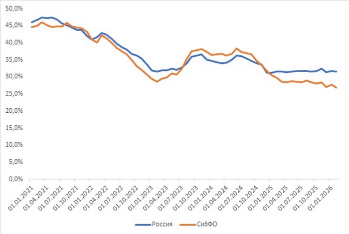В 2025 году люди, зарегистрированные на территории СибФО, в 14,4% случаев брали ипотеку на жилье вне пределов своего округа. По этому показателю округ находится на третьем месте после Северо-Кавказского (21,9%) и Дальневосточного (17,2%).