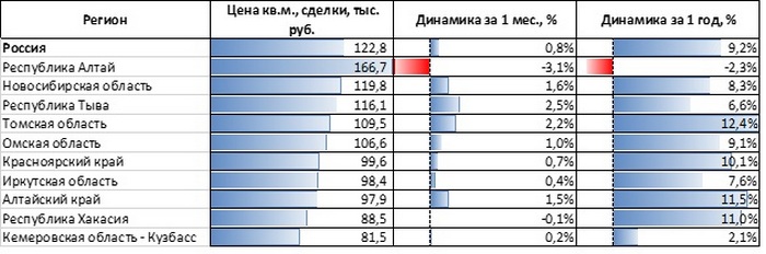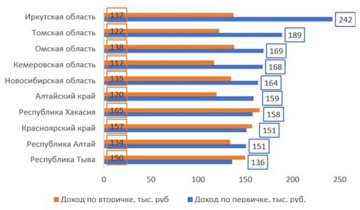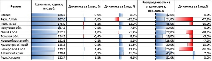 В сегменте готового жилья рост цен обогнал среднероссийский показатель также в четырех регионах (Томская область, Алтайский край, Республика Хакасия и Красноярский край). В Алтайском крае и Красноярском крае цены росли опережающими темпами как на первичном, так и на вторичном рынках. Республика Алтай оказалась единственным регионом СибФО, в котором цены в феврале 2026 года оказались ниже, чем годом ранее. При этом, как и на первичном рынке, они по-прежнему выше средних по России.