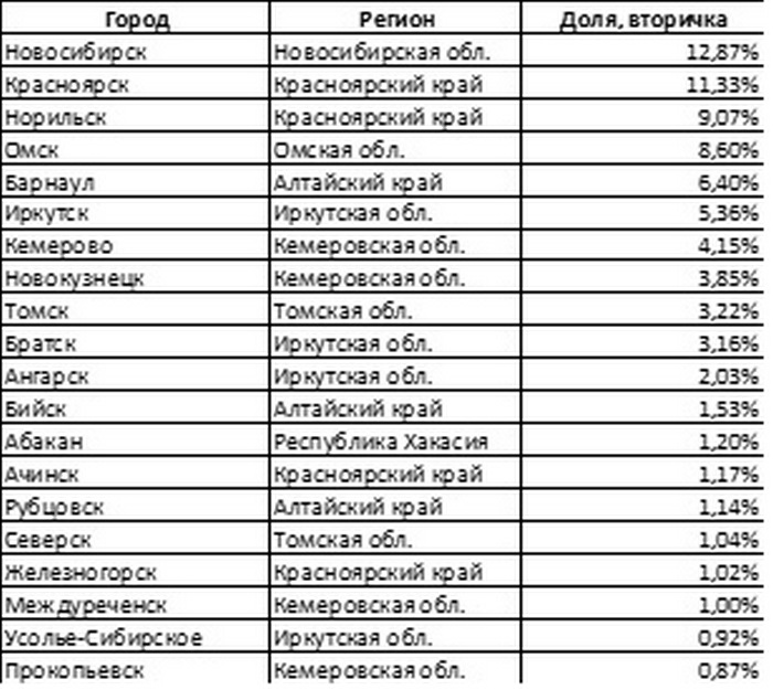 География вторичного жилья, ожидаемо, шире. На тройку лидеров приходится около трети – это Новосибирск (12,9%), Красноярск (11,3%) и Норильск (9,1%). Из городов, не являющихся административными центрами субъектов Федерации, чаще всего покупают готовые квартиры, кроме уже отмеченного Норильска, в Новокузнецке (3,9%) и Братске (3,2%).