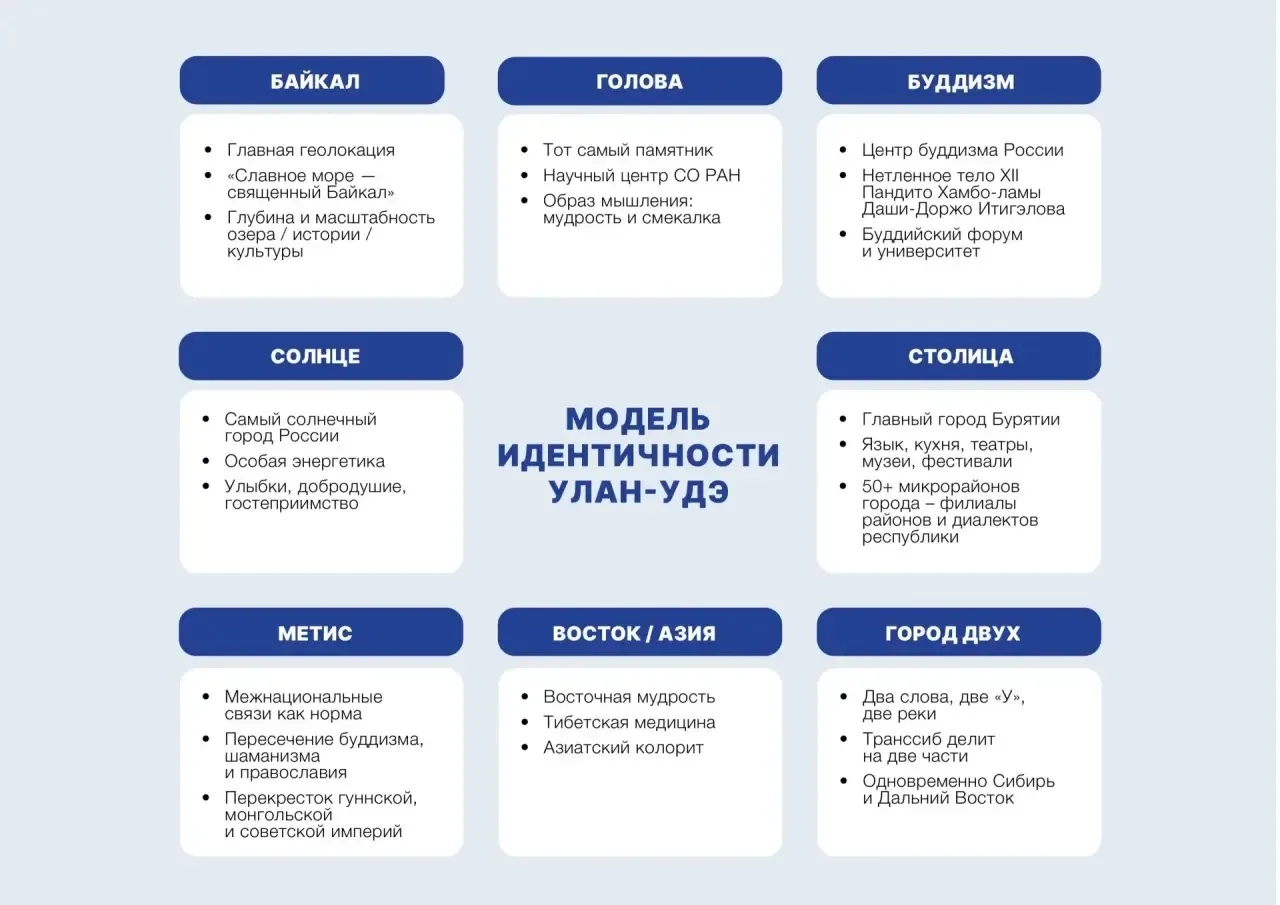 Какой горожане видят столицу Бурятии? Эксперты завершили опрос жителей Улан-Удэ – первый этап исследования для разработки бренда столицы Бурятии. Анализ мнений горожан лег в основу модели идентичности Улан-Удэ, которая состоит из восьми смысловых блоков, отражающих восприятие улан-удэнцами уникальности нашего города. Один из которых – «город двух».