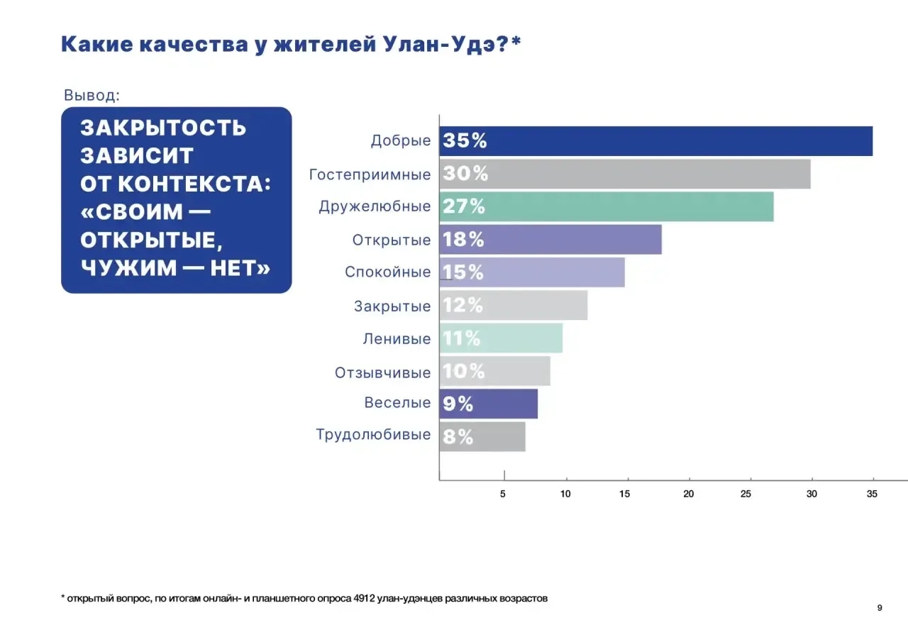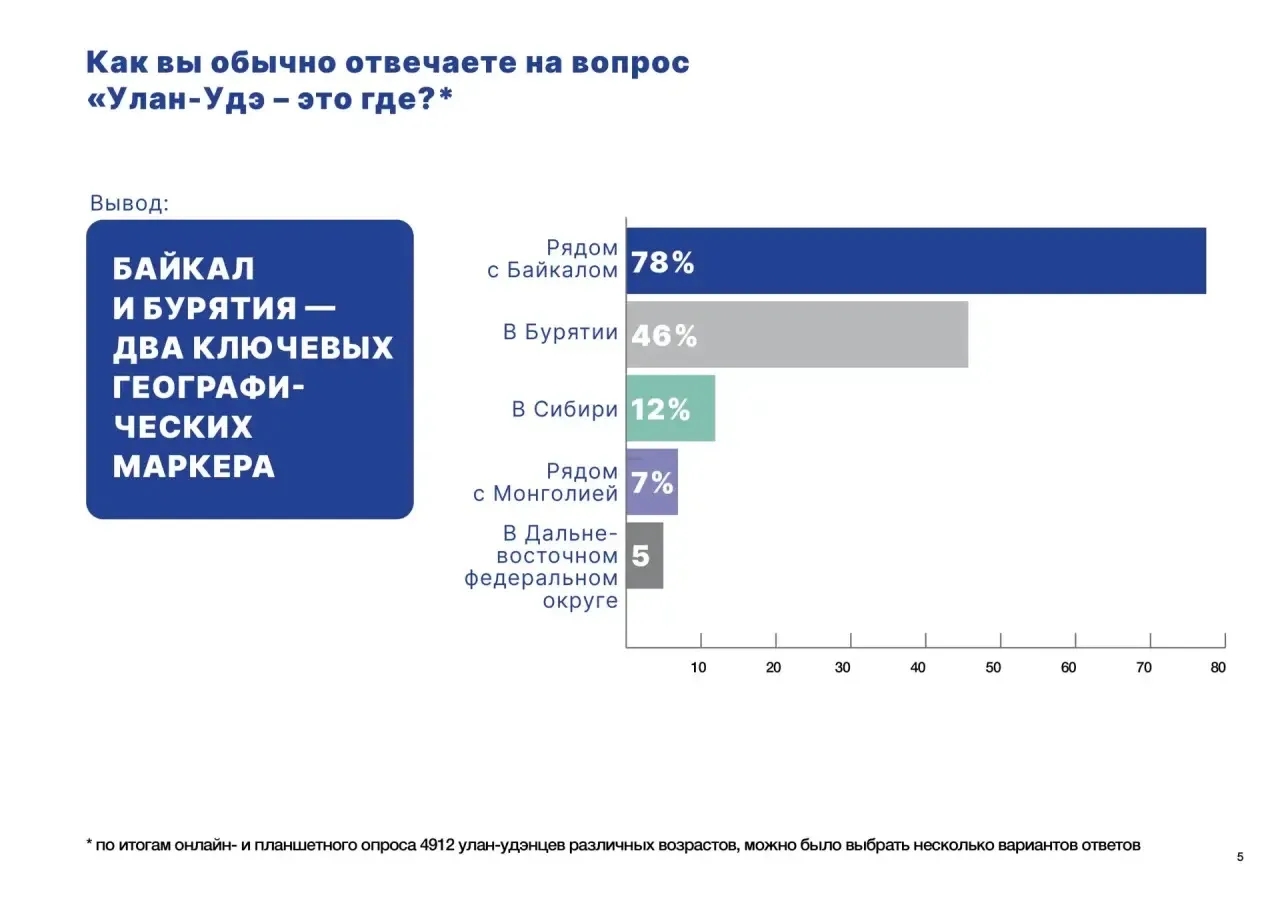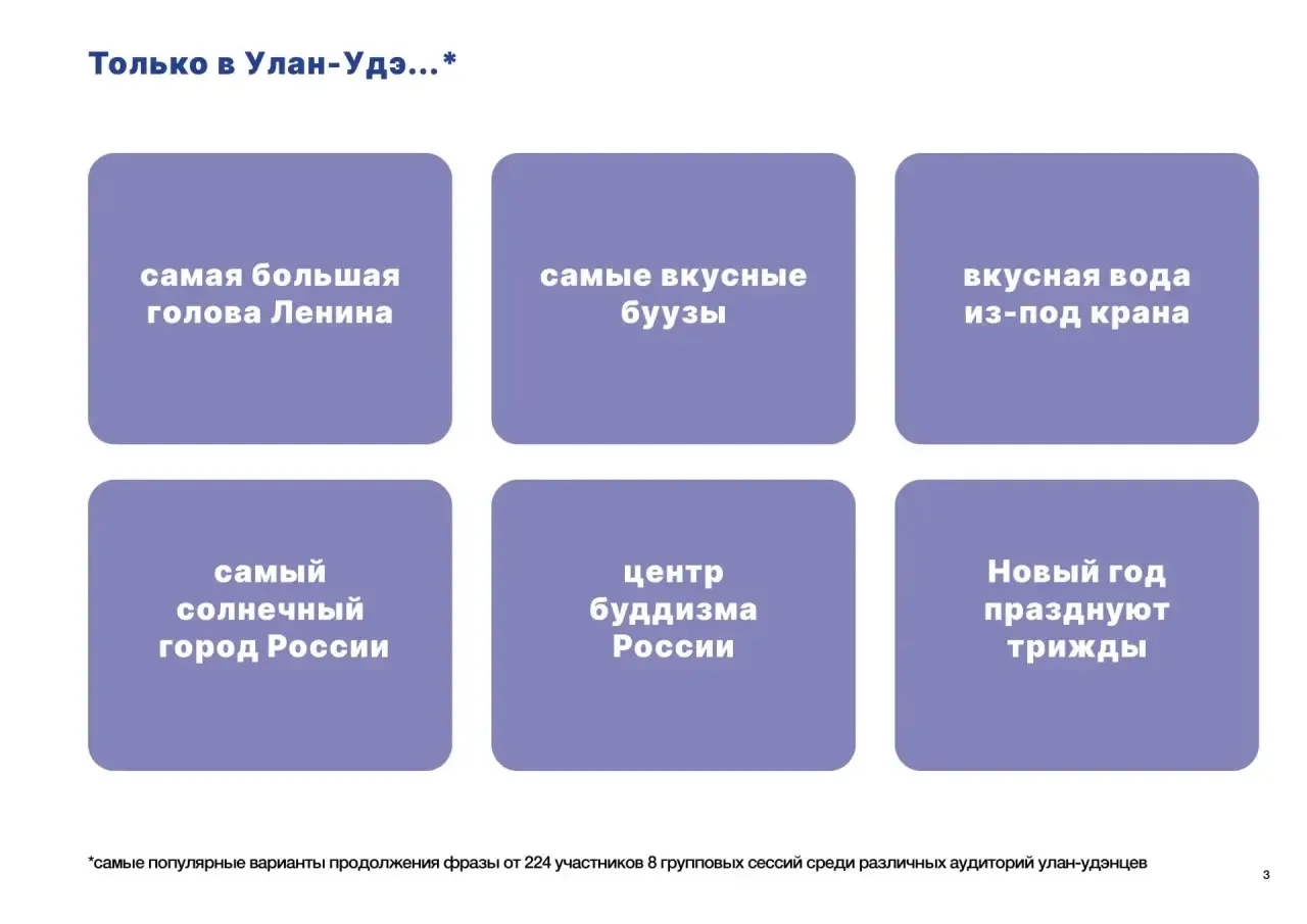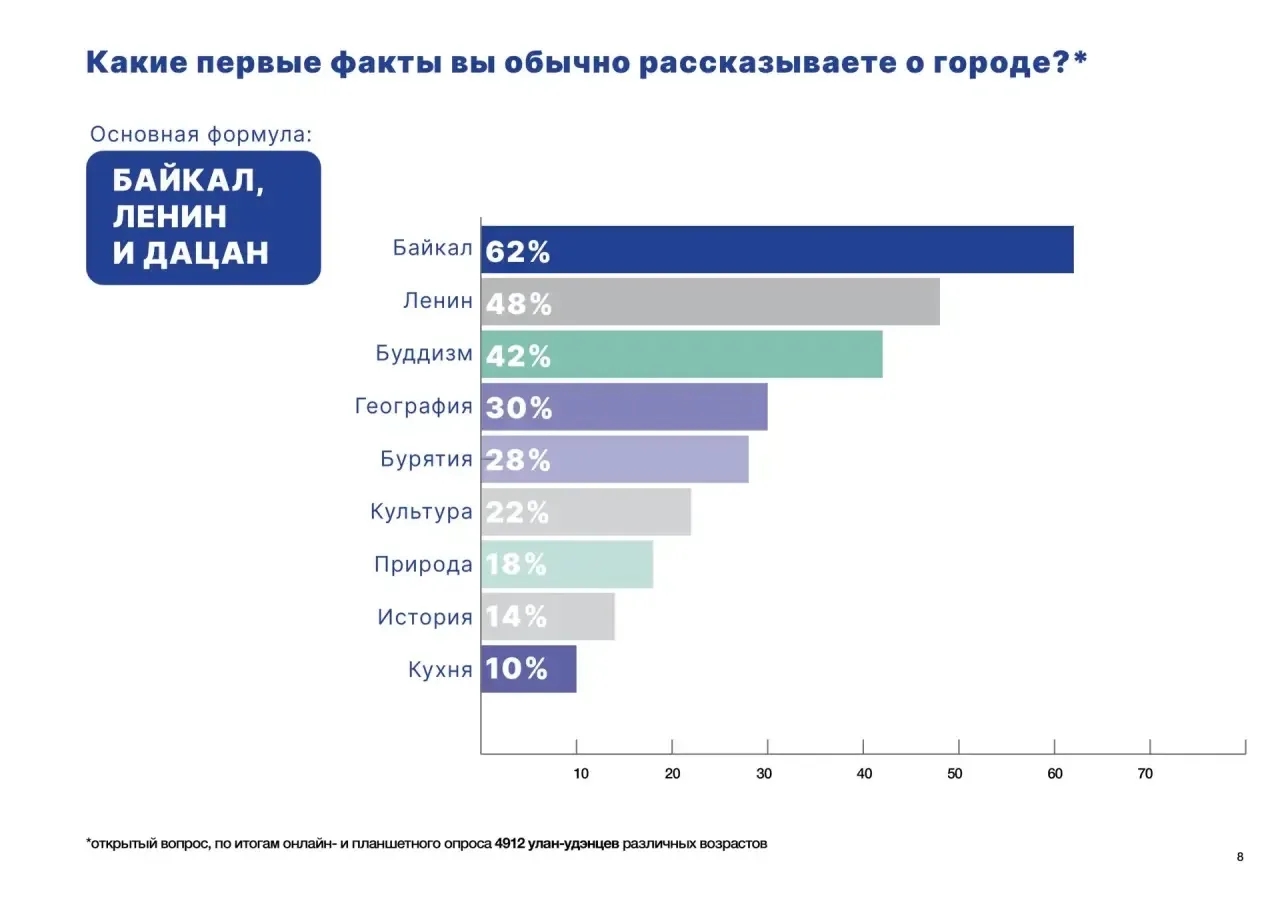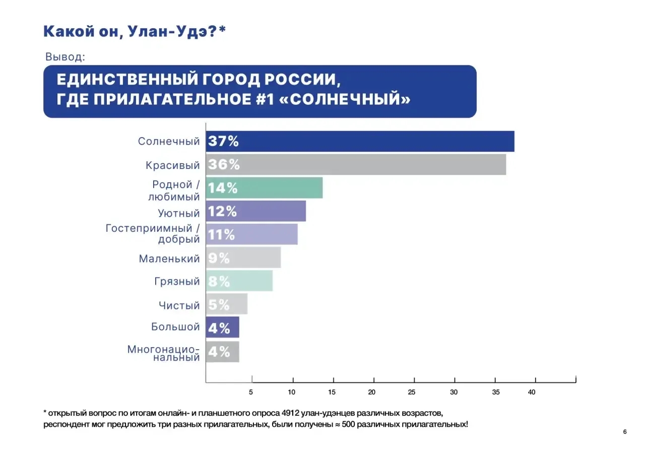 Более пяти тысяч человек прошли онлайн-опросы и интервью, на основании которых будет разрабатываться бренд города. Среди более чем 500 прилагательных, которыми жители описывают Улан-Удэ, ожидаемо, лидировало: «солнечный». Специалисты отмечают, что в пяти других городах, где велись исследования – Ангарске, Павловском посаде, Сарове, Нижневартовске, Когалыме – оно не входило даже топ-10 прилагательных, которыми жители чаще всего характеризовали свой город.