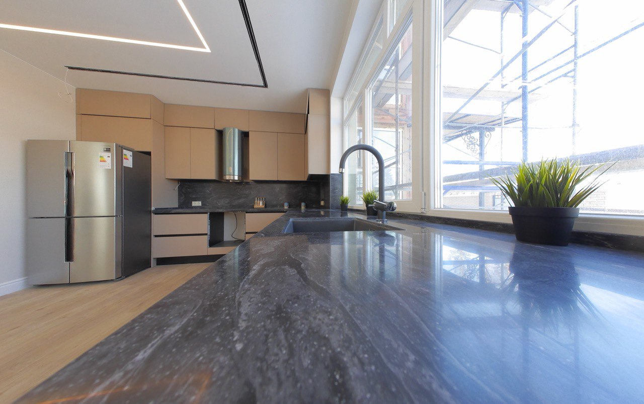 Есть натуральный камень – очень красивый, износостойкий и долговечный материал, но не подлежит ремонту. Дорогой, но имеет неограниченный выбор оттенков. Есть также новый материал – HP-плита, но он к нам заходит довольно тяжело, так как у нас нет мастеров для его обработки. Это прессованный материал, прочнейший, схожий с резиной, очень эстетичный за счёт тонкости и при этом неубиваемый. Однако каменщики не любят с ним работать, потому что он тяжёлый в обработке и от него много мусора. Не подлежит реставрации.
