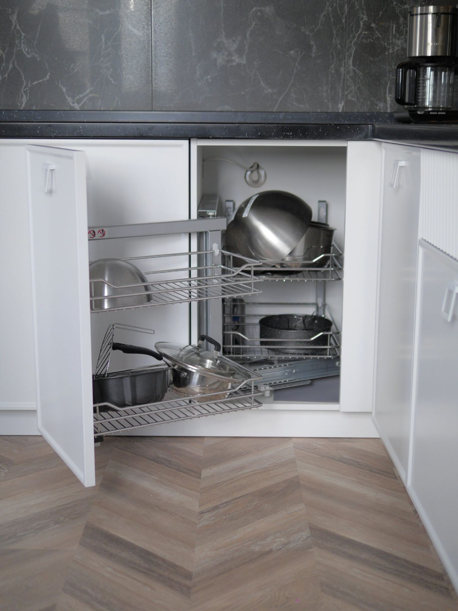 - угловые зоны — не мёртвая зона. Используем карусели, выкатные корзины, распашные фасады с доводчиками.