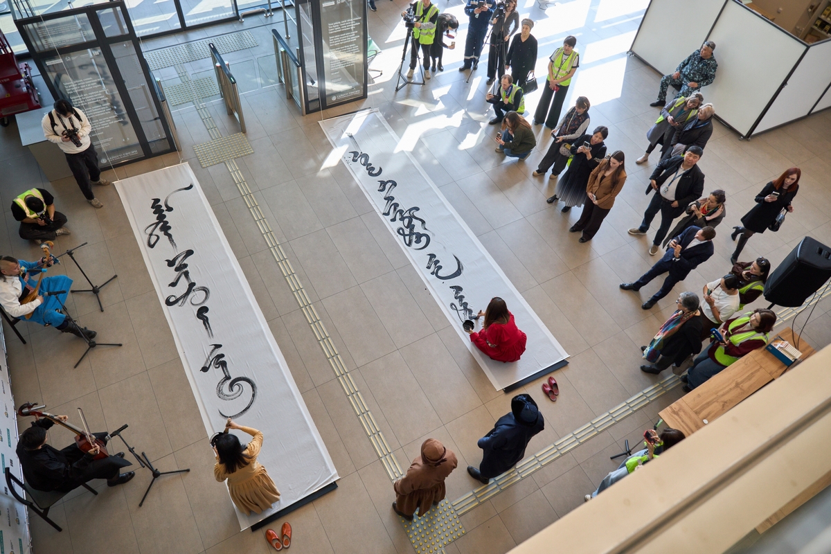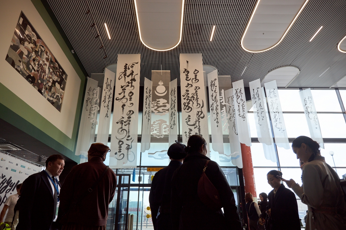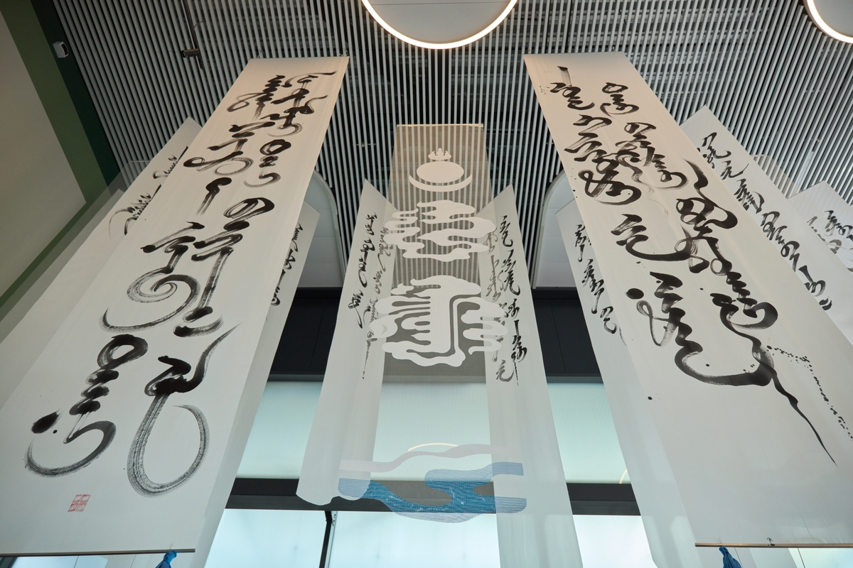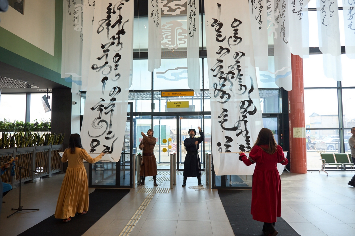 Главной особенностью выставки стало оформление текста гимна Бурятии в традиционной вертикальной письменности монгол бэшэг. Каллиграфы создали 21 полотно длиной от трех до пяти метров, которые закреплены на девятиметровой высоте и визуально создают эффект «парения» в пространстве терминала.