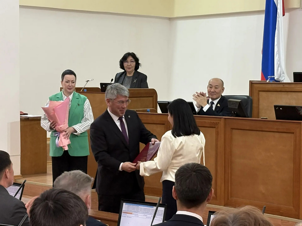 Глава региона Алексей Цыденов вручил Почётную грамоту Республики Бурятия специалисту организационного отдела аппарата парламента Татьяне Дамдиновой за вклад в развитие республиканского законодательства и парламентаризма.