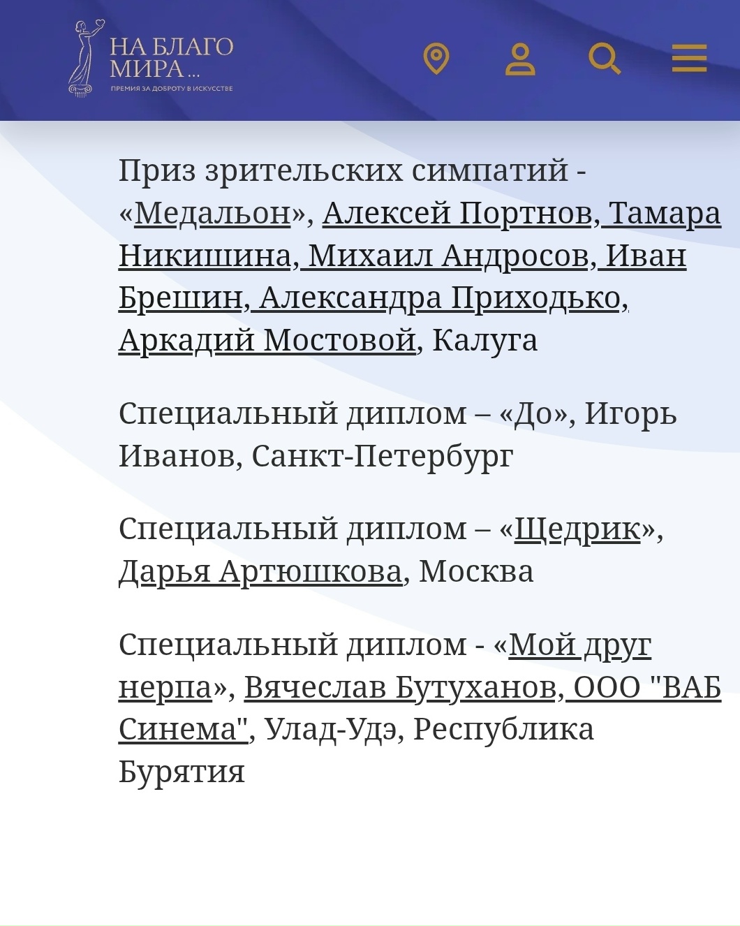 — 31 марта в Торгово-промышленной палате РФ в Москве прошла церемония награждения лауреатов профессионального конкурса премии «На благо мира». Наша картина получила специальный диплом в номинации «Игровое кино (взрослые)». Это очень важная для нас награда, потому что премия присуждается за доброту и гуманизм в искусстве. Её учредили по замыслу Валентины Толкуновой. В Экспертном совете — ведущие деятели культуры: Любовь Казарновская, Олег Штром, Григорий Гладков и многие другие. Они отметили «крепкий уровень» игровых фильмов и «действительно добрый посыл» нашей работы.