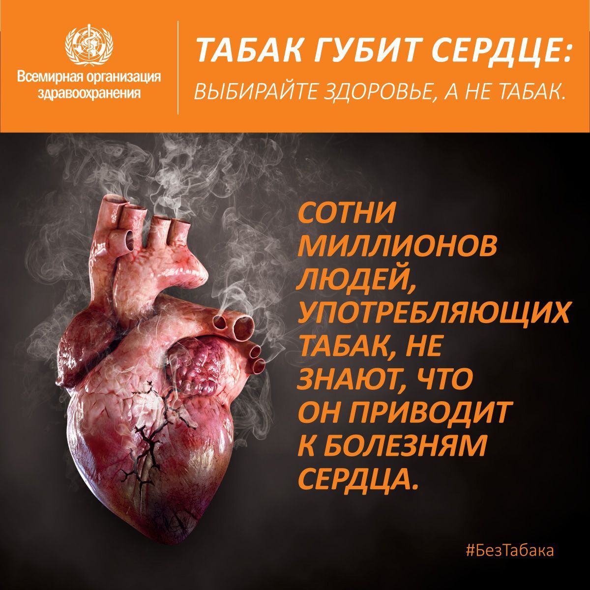 К сожалению, сотни миллионов людей, употребляющих табак, не знают, что он приводит к болезням сердца. На сегодняшний день именно табак является причиной более 2 млн ежегодных случаев смерти от сердечно-сосудистых заболеваний. Всего лишь прекратив употреблять табак, вы можете предотвратить возникновение у себя инфаркта или инсульта. И даже снизить риск у некурящих близких.