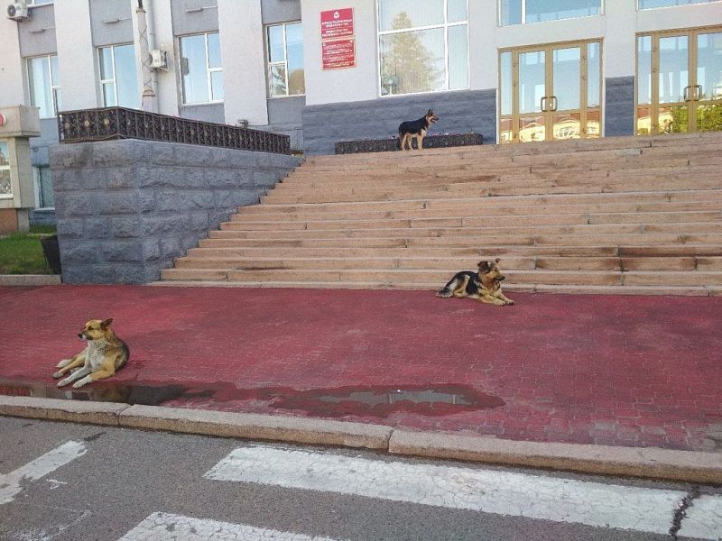 Утром 28 мая в центре города очевидцы заметили несколько бездомных собак. Животные разлеглись прямо на лестнице Дома правительства, что на улице Ленина. Прохожие и чиновники, спешащие на работу, не обращали на них никакого внимания.