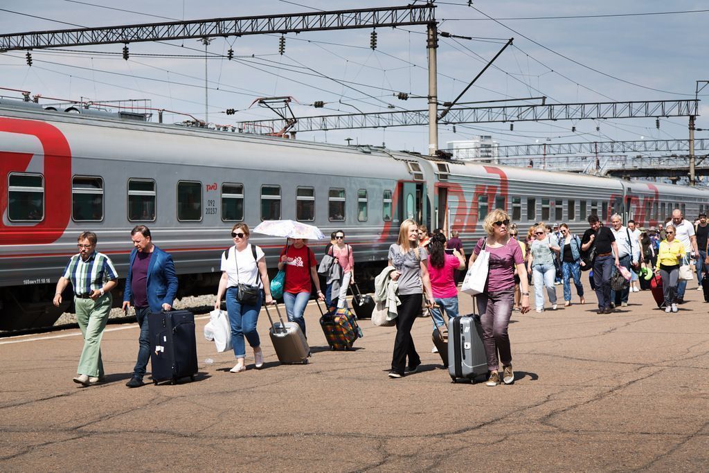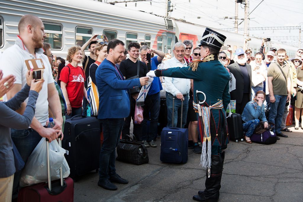 На железнодорожном вокзале «Маяковку» встречало руководство и артисты Русского драматического театра имени Н. Бестужева. Для почетных гостей прямо на перроне было организовано небольшое театрализованное представление. Директору московского театра Леониду Ошарину вручили штандарт с копией флага ГРДТ.