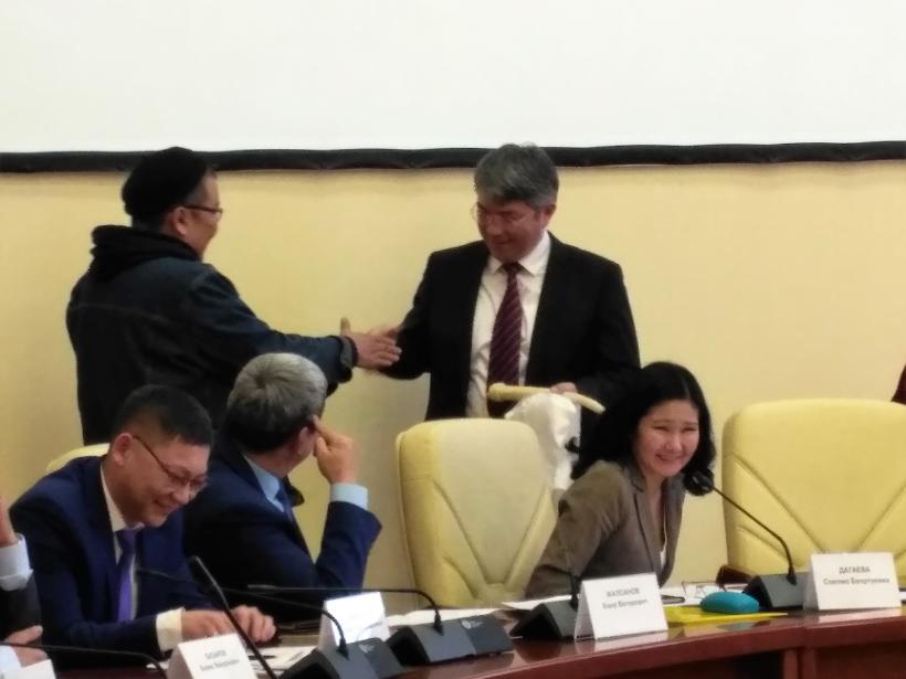 По окончании заседания символичный подарок – кожаный ташуур (плеть), который раньше использовали монгольские всадники, - глава республики получил из рук члена творческого союза художников Зандана Дугарова.