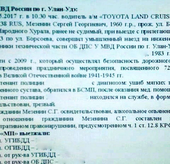 По данным источника издания, 9 мая в 10.30 водитель автомобиля «Toyota Land Cruiser 200» Сергей Мезенин, при выезде с прилегающей территории дома № 13 по улице Борсоева совершил умышленный наезд на дежурившего сотрудника ДПС.