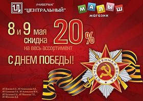 В честь ВЕЛИКОГО праздника Дня Победы! 8 и 9 мая Универмаг "Центральный" и магазин "Малыш" дарят скидку 20% на весь ассортимент 5 мая 2013 1824