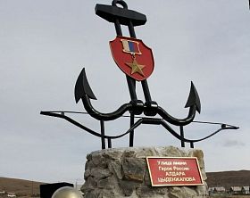 Монумент представляет собой каменное основание, как в буддийской ступе, которое венчает морской якорь. У якоря находится боевой лук и в центре щит с символикой звезды героя