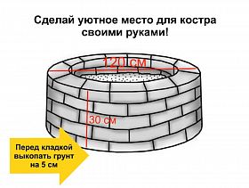 МЕСТО И РАЗМЕР. Подбирая место для костра, помните, что его нужно разместить на расстоянии минимум 8 метров от строений и деревьев. Рекомендуемые размеры очага: диаметр 60-120 см, высота 30 см. Начертите на земле круг, соблюдая рекомендуемый диаметр. Для разметки по газону можно использовать аэрозольную краску. Из размеченного круга выкопайте около 5 сантиметров грунта.