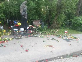 Была опубликована фотография, на которой видно, что вокруг могилы разбросаны сломанные цветы и портреты музыканта