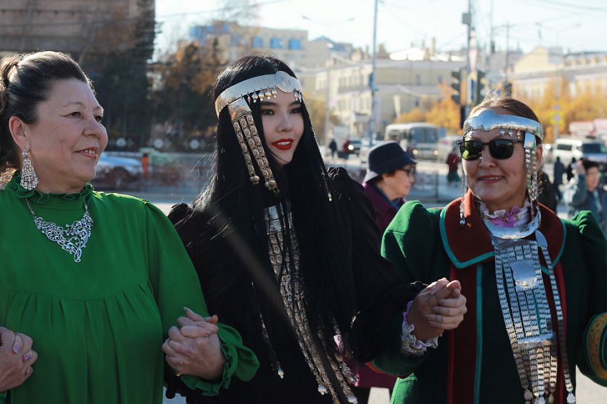 Десятки горожан облачились в национальные костюмы и станцевали с красавицей национальный танец осуохай