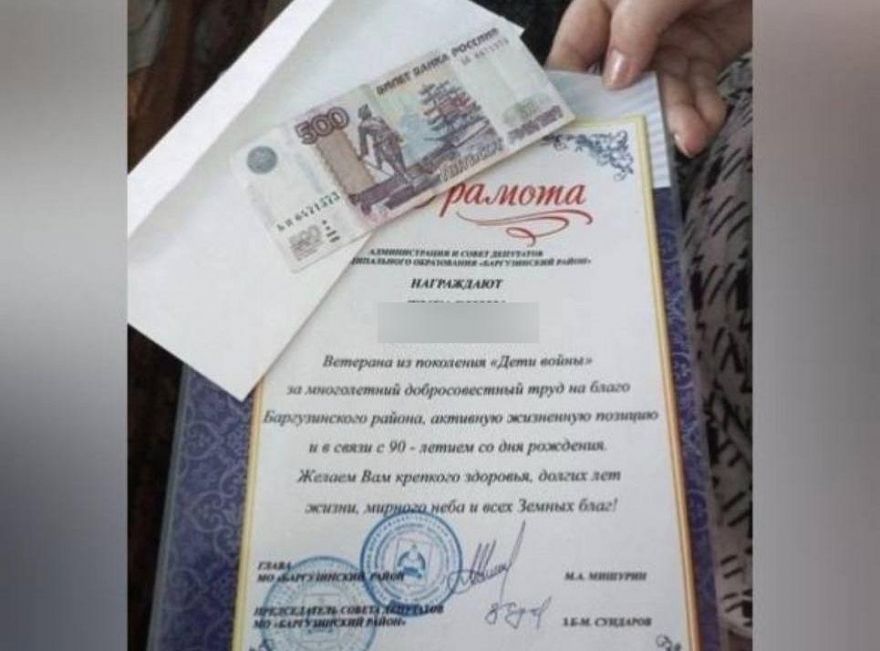 В Бурятии ветерану труда районная администрация подарила на 90-летний юбилей 500 рублей