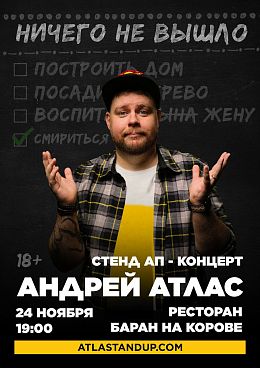 Стендап-концерт «Ничего не вышло» - второй сольный концерт Андрея Атласа. И, нет, название «ничего не вышло» - это не отсылка к первому. Это мысль, с которой так или иначе сталкивается каждый человек в самых разных обстоятельствах - в работе, в личной жизни, в мечтах, в мечтах о личной жизни на работе.