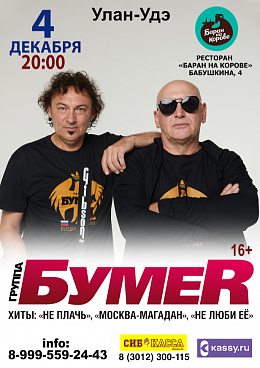 Встречайте! Культовая легенда шансона - группа «Бумер» Для Вас прозвучат все хиты: «Не плачь», «Москва-Магадан», «Не люби её», «Караван» и многое-многое другое…
